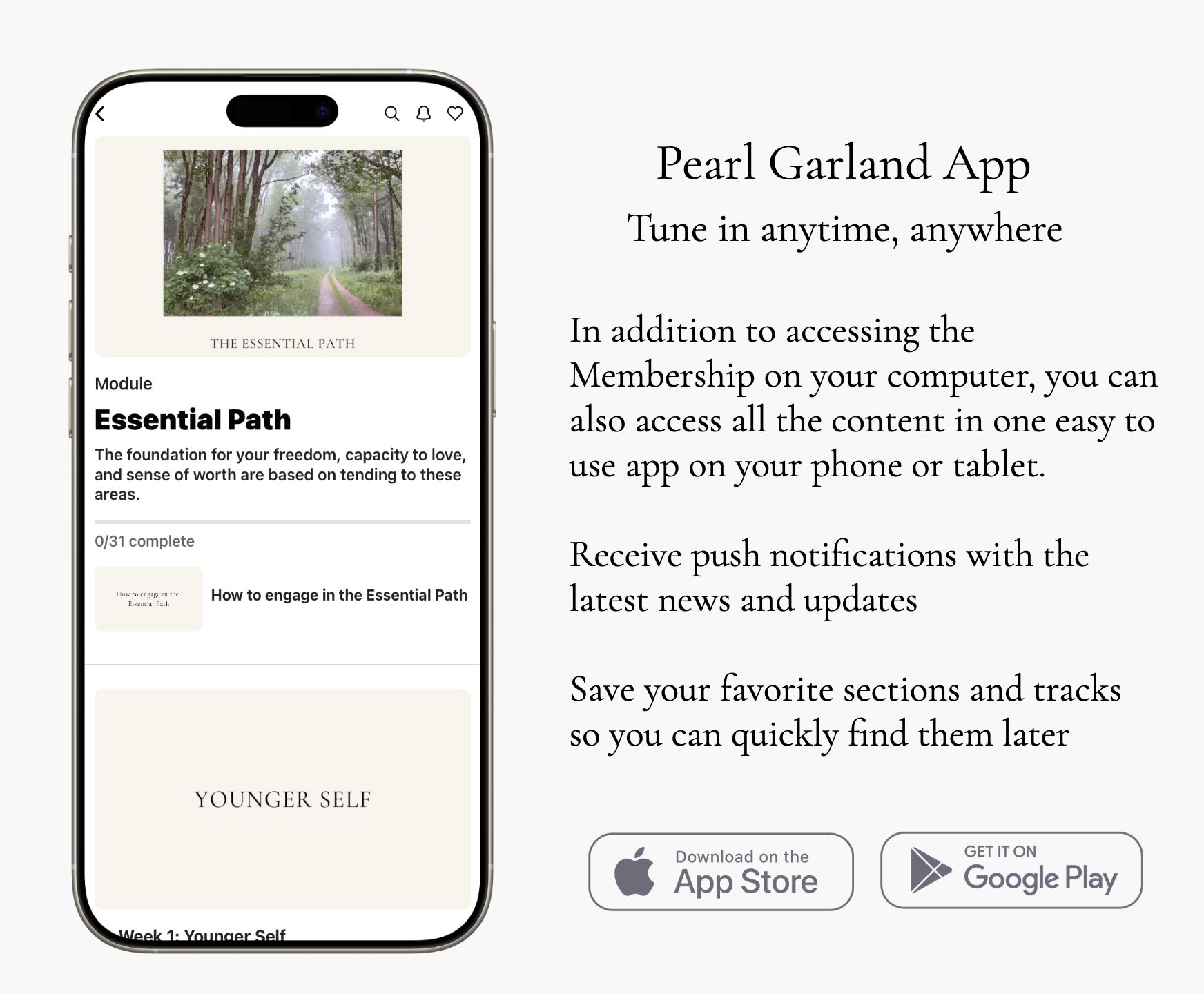 The membership is designed to support you through all the moments of your journey using methods and philosophies from Buddhist and Western psychology, neuroscience, interpersonal biology, and a variety of embodied and analytical therapeutic methods. With curated content to allow for the realignment with your genuine self, Pearl Garland invites you to dive deeper and participate in the co-creative blossoming of your life.