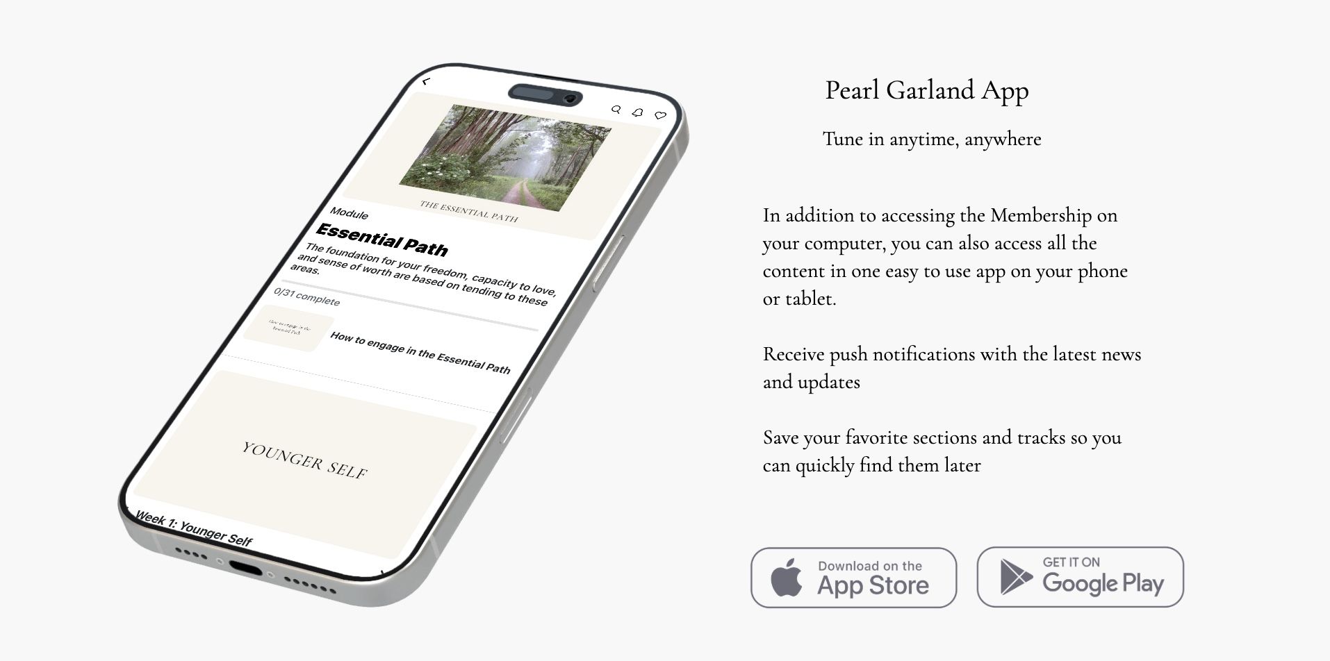 Whether you have been devoted to transformation for years or are new to the process, receive pathways to inhabit your most aligned way of being. A guiding companion that easily integrates into any lifestyle, Pearl Garland offers neural re-patterning audios, meditations, journal prompts, lessons, and step-by-step blueprints to transform your relationship with yourself, others, and the world.